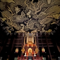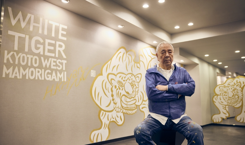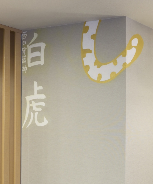 絵師Ki-Yan(木村英輝)氏による本作は、白虎がホテル内へ舞い降り、ロビーでその姿を現す流れを表現しています。入口の壁に描かれた白虎の尾がホテル全体へその気配を導き、ロビーで堂々と姿を現す白虎は、訪れる人々を静かに見守る存在として描かれています。空間全体で白虎の「気の流れ」や「守護の象徴」を表現し、京都の伝統思想と現代アートの躍動が融合したロビーとなっています。