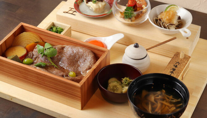 すき焼き重と京おばんざいをリーズナブルに楽しめる専門店。希少なブランド和牛を使用した料理が人気です。