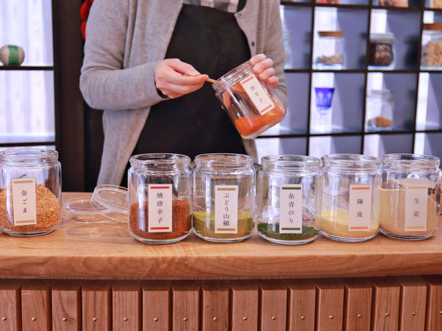 八坂の塔のふもとにある、創業110年以上の乾物専門店。唐辛子や胡麻、山椒などを使い、自分好みの配合でオリジナル七味作りが体験できます。