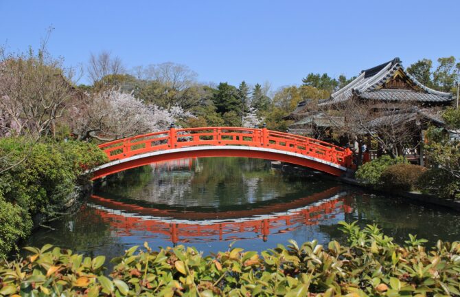 794年、桓武天皇によって造られた由緒ある庭園。願いが叶うとされる法成橋や、恵方の方角を祀る恵方社があり、パワースポットとしても親しまれています。